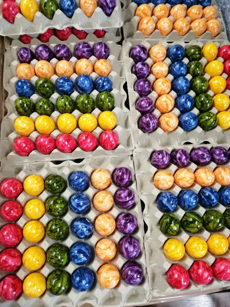 Für unseren Osterhasenalarm gibt es immer Etliches vorzubereiten. Wir bestellen hart, gekochte, bunt gefärbte Bio-Eier. Sind die Eier ein paar Tage vor Ostern angekommen, werden sie konfektioniert, also zusammen mit den Salztütchen in die Körbchen gelegt. Dafür haben wir auch einen Eierverteilungsplan. Das ist Handarbeit und bei 5.000 Eiern kommen wir ganz schon aus der Puste. Bis Ostersamstag werden die Eier kühl gelagert.