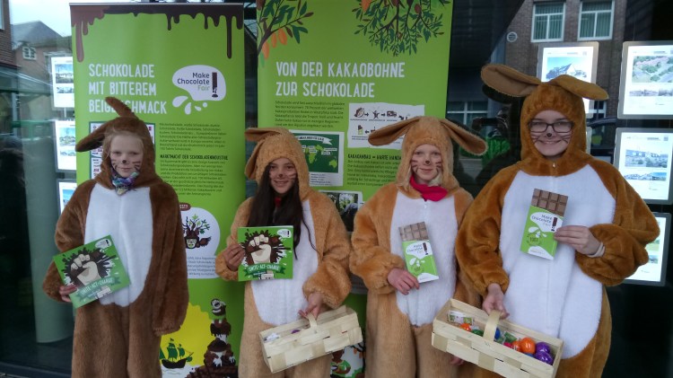 An den Spielstationen erhalten die Kinder kleine, fair gehandelte Ostergrüße aus Schokolade. Damit machen die Niebüller Stadthasen auf die Kampagne „Make Chocolate Fair“ des INKOTA Netzwerk e.V. aufmerksam, das sich für ein existenzsicherndes Einkommen der Kakaobauern im globalen Süden einsetzt.